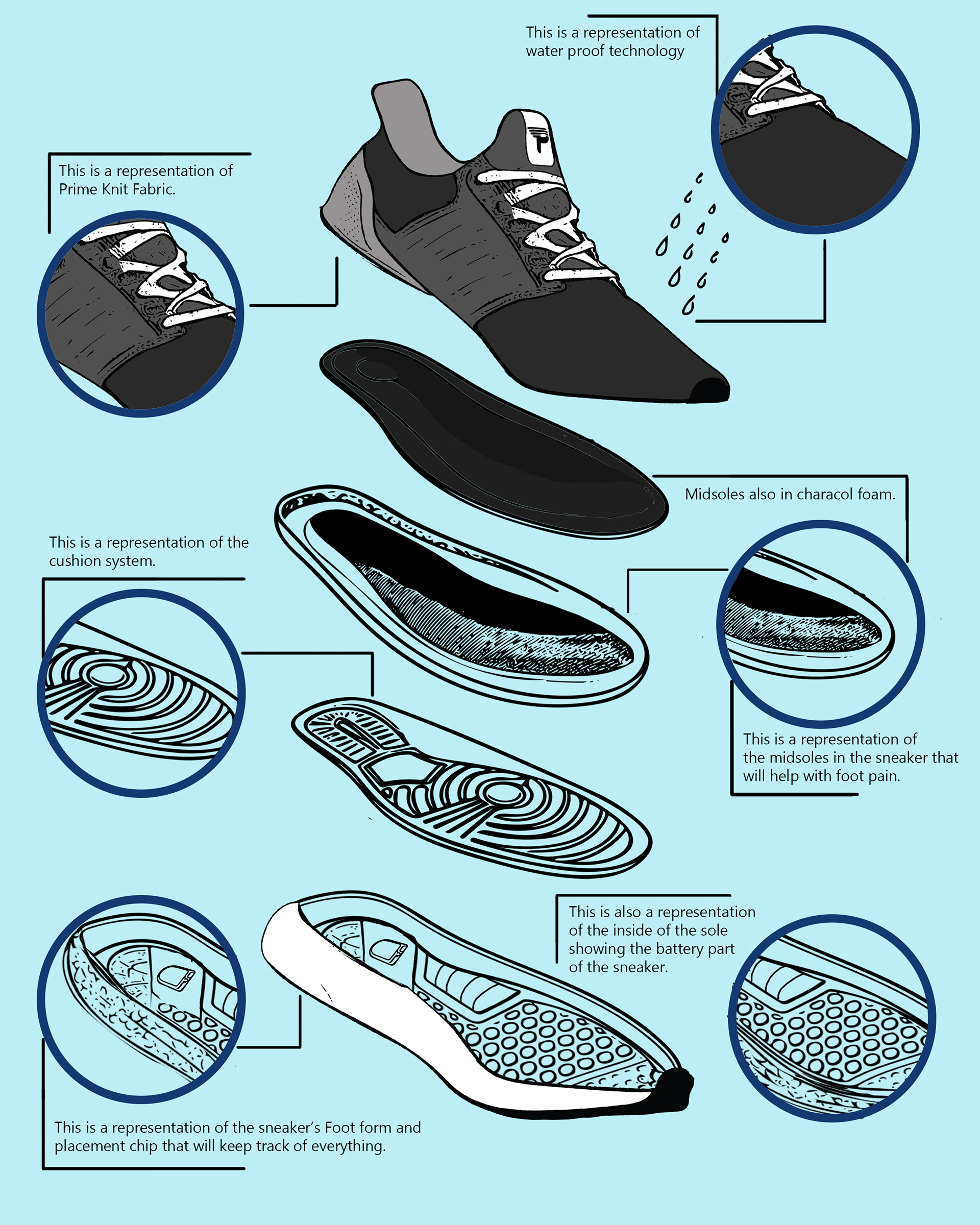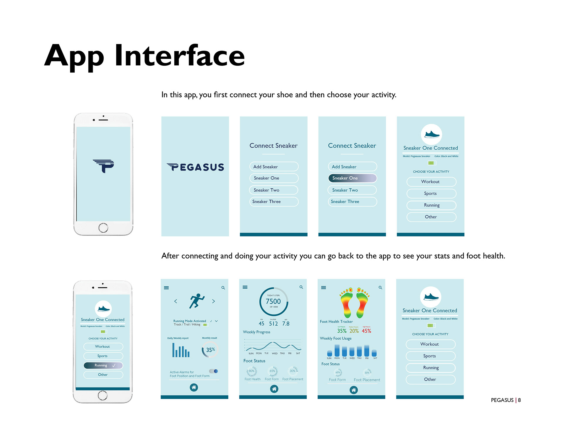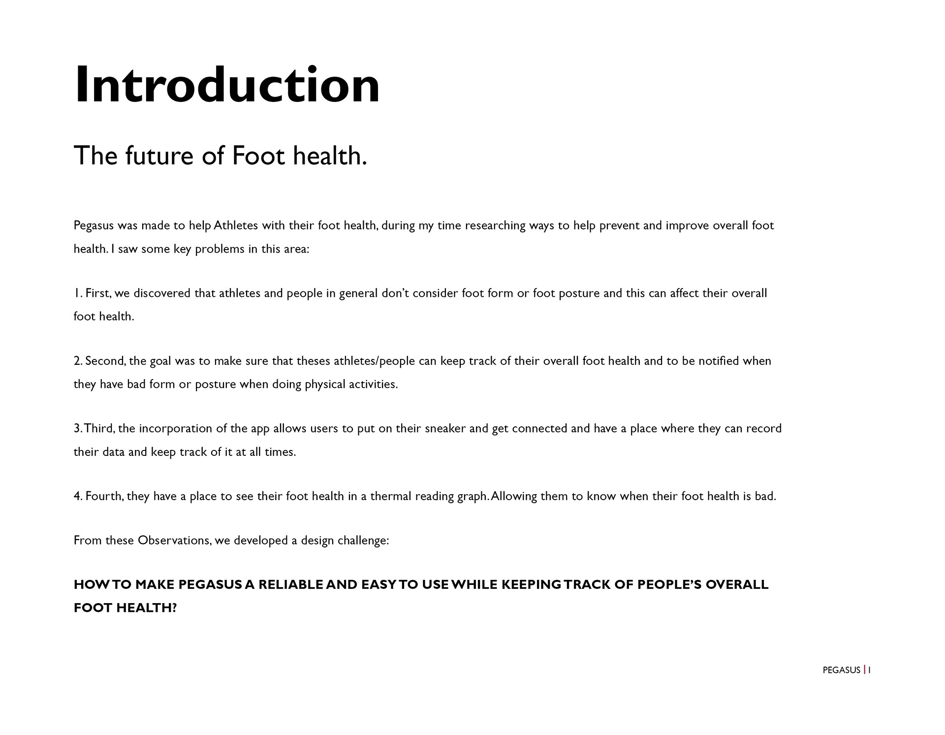 Pegasus is a technological advanced shoe aiding overall foot health. Pegasus was made to help the user understand foot health and to see the results of their activities while wear the Pegasus shoe.